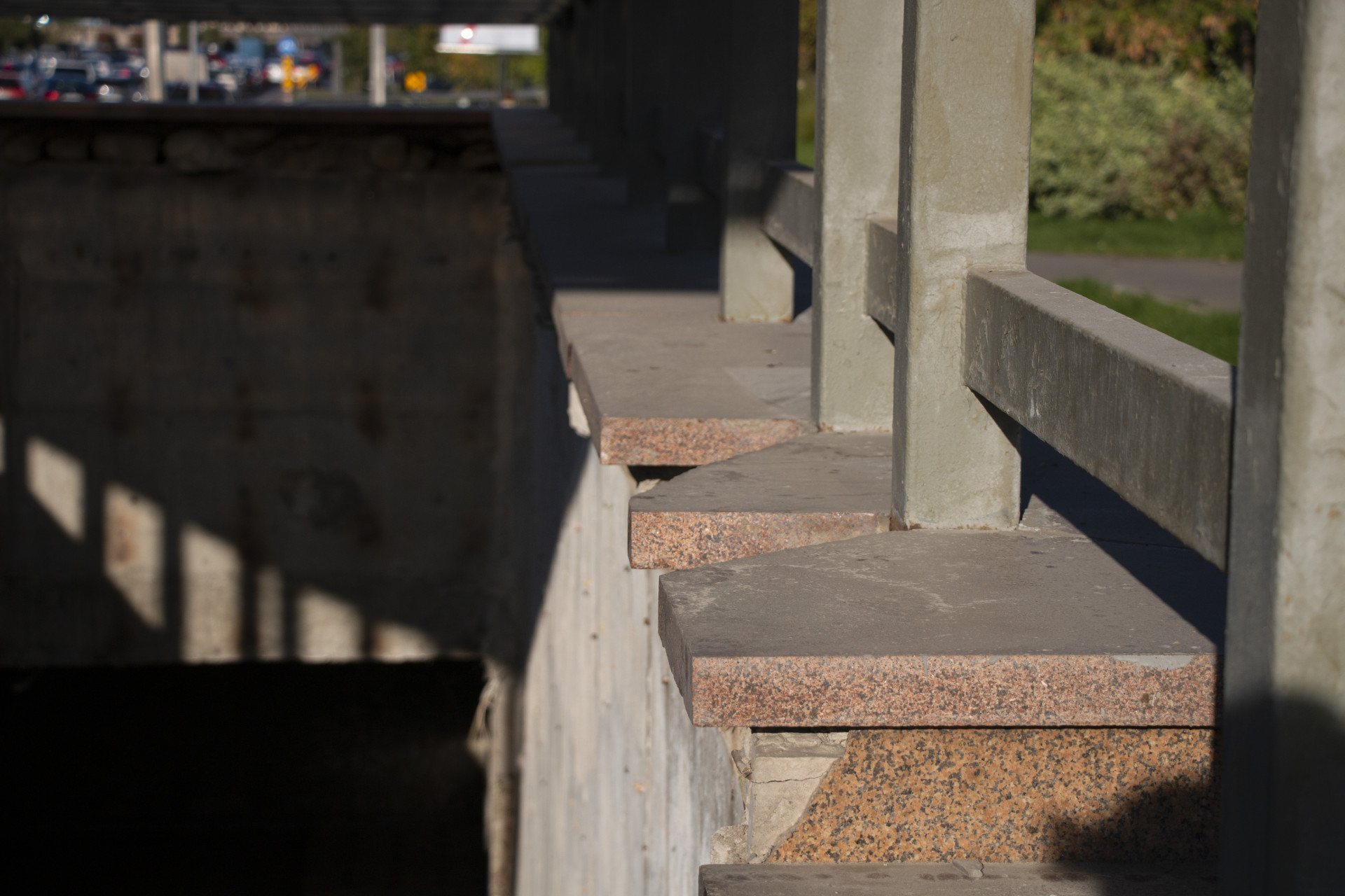 Из оставшегося после демонтажа: гранитные ступени и уличные парапеты. Однако на парапетах часть гранита уже повреждена. Возможно, что это произошло при демонтаже настенной плитки.