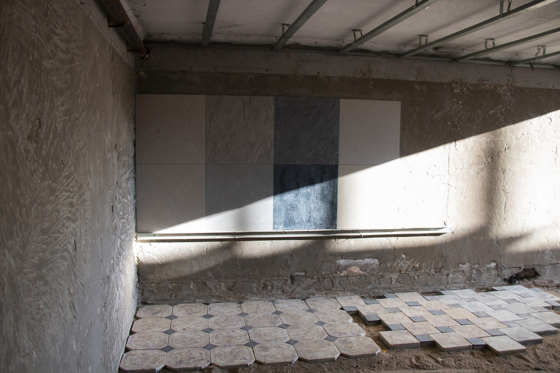 На одной из стен можно заметить несколько видов кафеля, под ними несколько видов брусчатки на полу. Вероятно, что подрядчик сделал это для того, чтобы выбрать наиболее подходящие варианты.