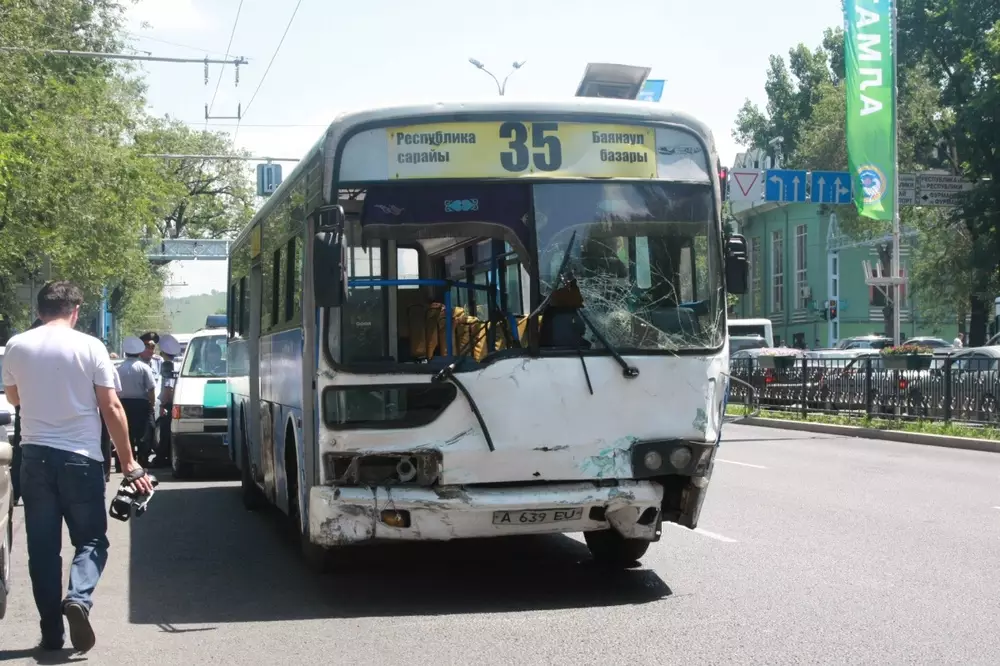 Сотрудник дорожной полиции пострадал в ДТП в центре Алматы Автобус 35-го маршрута. ©Чингиз Джумагулов