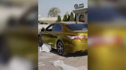 Девушка лишь запрыгивает за руль золотой Toyota Camry и уезжает с мероприятия, оставив возле ресторана расстроенного жениха и фату на асфальте.