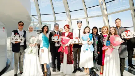 В праздничном мероприятии приняли участие шесть пар, четыре из которых являются молодоженами. Им в торжественной обстановке были вручены свидетельства о заключении брака. Молодая столичная пара Тамерлан и Наргиз Ештаевы рассказали, что они знакомы практически с самого рождения.