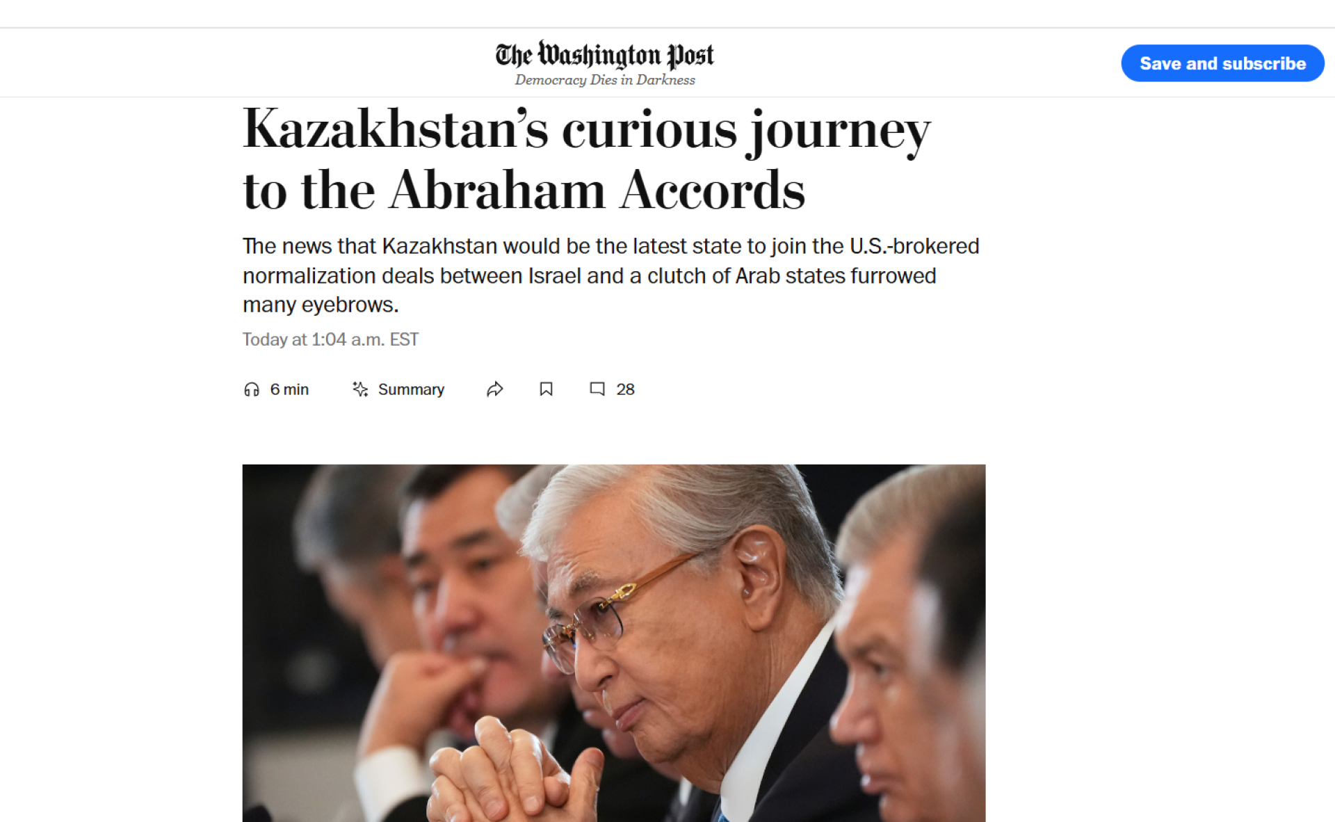 Американское издание The Washington Post опубликовало колонку журналиста Ишана Тарура под заголовком "Любопытный путь Казахстана к Соглашениям Авраама". Автор анализирует решение Казахстана присоединиться к пакту о нормализации отношений с Израилем и арабскими странами – и отмечает, что этот шаг вызвал удивление у западных наблюдателей. Что пишут о нашей стране в The Washington Post, читайте в обзоре Tengrinews.kz.