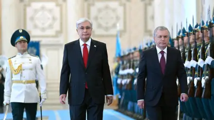 Республиканские телеканалы показали, как кортеж Шавката Мирзиеева проехал к зданию Акорды. Президент Узбекистана поприветствовал членов казахстанского кабмина, после чего Токаев поприветствовал делегацию из Узбекистана. Президенты заслушали гимны обеих стран и направились в зал для переговоров.