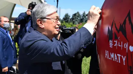 "Касым-Жомарт Токаев оставил автограф на символе Алматы - экспозиции, сделанной в форме яблока", - говорится в сообщении пресс-службы Президента в Telegram-канале "Борт N1".