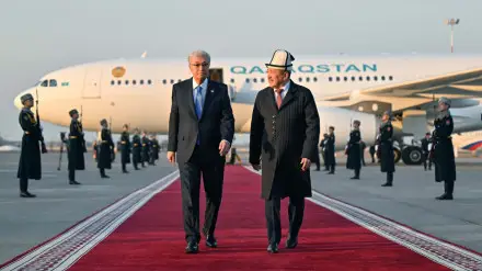 Торжественная церемония встречи Президента Токаева и казахстанской делегации в здании аэропорта Бишкека.