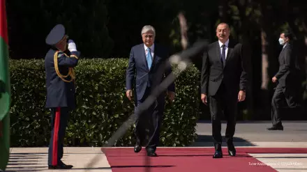 Церемония встречи прошла в торжественной обстановке. Алиев встретил Токаева у автомобиля.