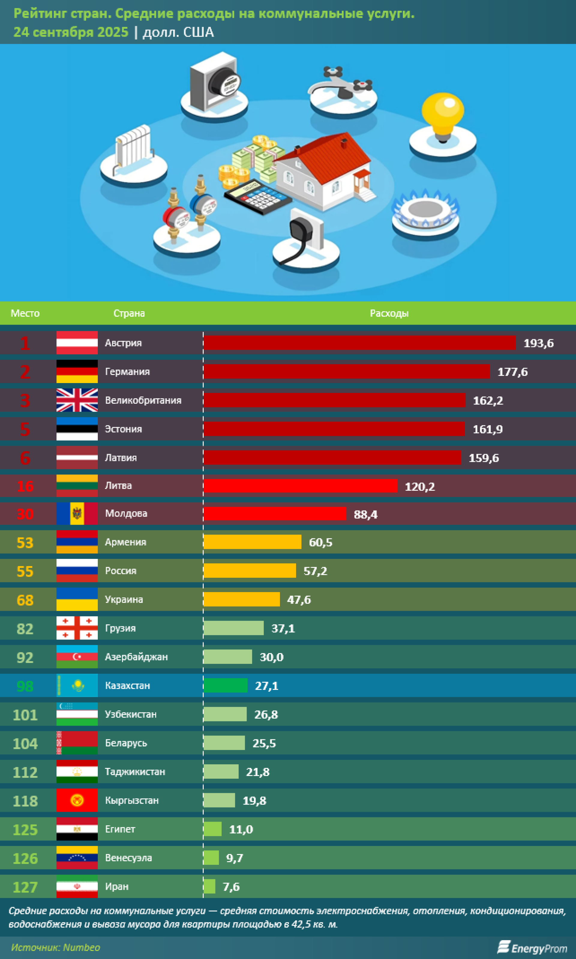 "По данным на 24 сентября 2025 года, расходы на эти услуги в Казахстане оказались одними из самых скромных как среди стран СНГ и Центральной Азии (и в целом постсоветского пространства), так и в глобальном масштабе. Средние месячные расходы на жилищно-коммунальные услуги по вышеупомянутому списку в Казахстане составили всего 27,1 доллара, или около 15 тысяч тенге. С этим показателем Казахстан занял лишь 98-е место по дороговизне жилищно-коммунальных услуг среди 127 стран, вошедших в рейтинг", - говорится в публикации.