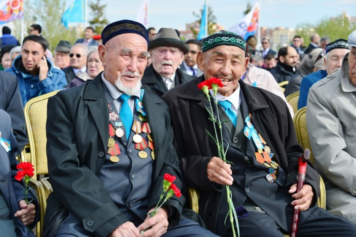Памятник "Отан қорғаушылар" в этот день увенчали тысячи гвоздик. Возложение цветов сопровождалось музыкальными произведениями в исполнении Президентского оркестра Службы государственной охраны РК. Героев, сражавшихся на полях самой кровопролитной войны, тех, кто положил свои жизни на алтарь победы, почтили минутой молчания.