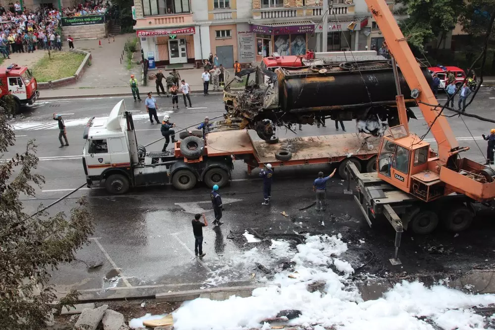 Бензовоз взорвался на пересечении проспекта Сейфуллина и улицы Кабанбай батыра 27 июня. В результате огонь перекинулся на жилой дом, пострадали 39 квартир и 12 припаркованных авто. Погиб водитель бензовоза - 27-летний Александр Горюнов.