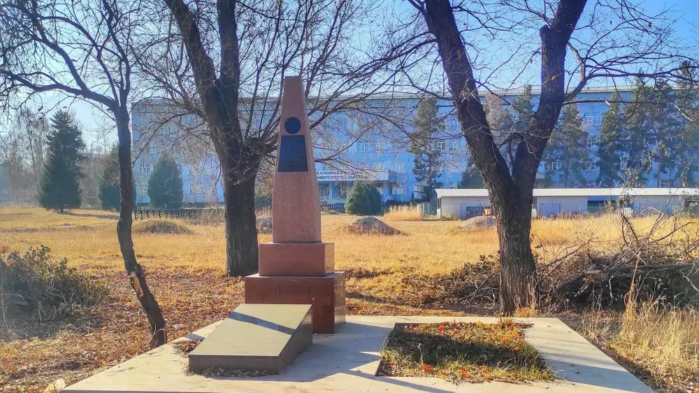 "Кто был в Талгаре, тот видел, что при въезде в город с правой стороны находится колледж, на территории которого стоит стела, а рядом с ней - две трехдюймовые пехотные пушки. Недалеко от них с правой стороны расположен неухоженный, заросший сухостоем и деревьями памятник видному государственному и общественному деятелю Алханбеку Малькееву, именем которого названы улицы и государственные учреждения.