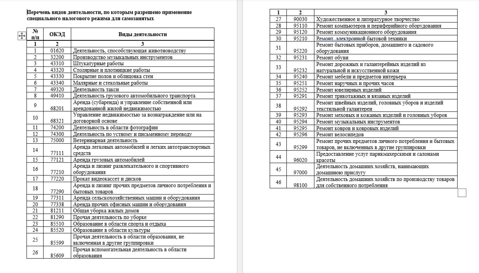 Второй документ, опубликованный министерством, - проект постановления правительства, утверждающий перечень видов деятельности, по которым разрешено применение специального налогового режима для самозанятых. В него вошли 46 видов деятельности. С полым списком можно ознакомиться ниже.