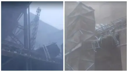 Ураган повалил дымовую трубу на ферросплавном заводе в Аксу Кадры из видео