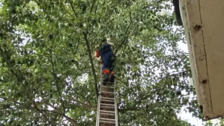 "В столице хвостатый забрался на дерево и не мог слезть. Жители дома не остались равнодушными к громкому мяуканью и обратились за помощью к сотрудникам МЧС. Забравшись по лестнице и сняв с дерева кота, спасатель передал питомца хозяйке", - говорится в сообщении.