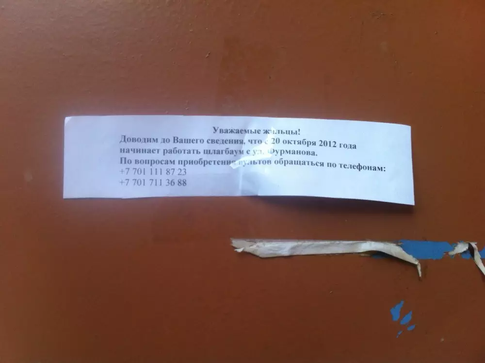 Речь идет о домах №51 и №53 по улице Фурманова. Во дворы существует единый въезд, то есть с улицы Фурманова (смотрите схему. - Прим. автора). Как рассказал один из жителей, не пожелавший представиться, несколько месяцев назад соседи решили установить шлагбаум и даже повесили объявление о сборе денег. По 10 тысяч тенге с каждого жильца, говорит он.