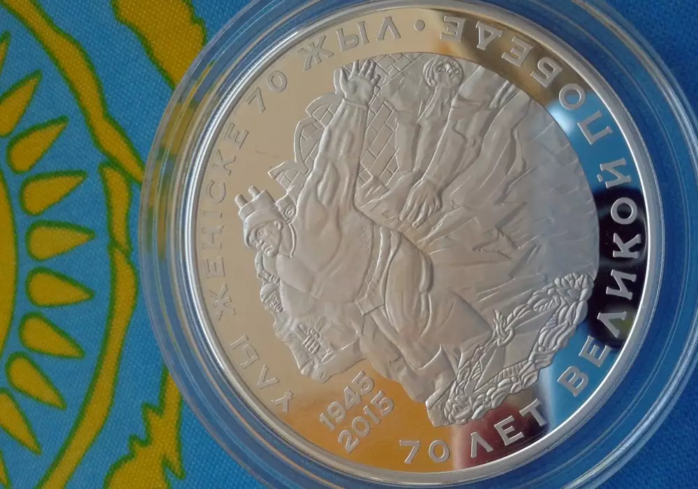 Монеты, которые получили ветераны ВОВ Казахстана, выпущены в обращение 31 марта 2015 года номинальной стоимостью в 500 тенге. На лицевой стороне (аверсе) в верхней части изображен герб Республики Казахстан в обрамлении пятикратно повернутой орнаментальной восьмиконечной розетки и надписи "Қазақстан ұлттық банкі". В нижней части - надпись "500 теңге". Слева от номинала расположен товарный знак Казахстанского монетного двора и надпись "24 g", обозначающая массу, справа - надпись "Ag 925", обозначающая металл, из которого изготовлена монета, и его пробу. По окружности монеты проходят бусовый ободок и выступающий кант.