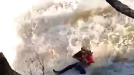 Сообщается, что мужчина с дочерью хотел сфотографироваться на опасной локации и оказался вместе с ней в воде. Судя по кадрам, отец сумел зацепиться за валун и удержаться. К счастью, пишут очевидцы, все закончилось хорошо.