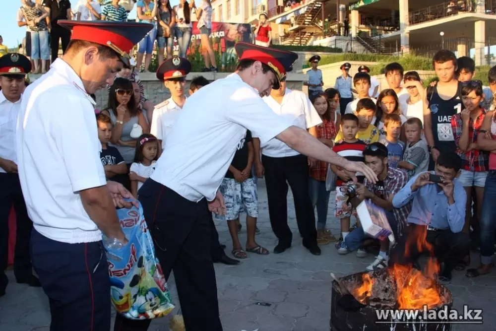 В Актау полицейские отметили День борьбы с наркотиками сожжением нескольких килограммов наркотиков, сообщает "Лада.kz". Вечером 26 июня на набережной у кафе "Алина" полиция организовала массовое действо с участием студентов, школьников и своих сотрудников. Вначале спецподразделение "Арлан" продемонстрировало отдыхающим на море постановочный захват наркодельцов. Далее сотрудники полиции сожгли в металлической бочке несколько пакетов с героином и марихуаной. После этого на площади у кафе "Алина" состоялся концерт.