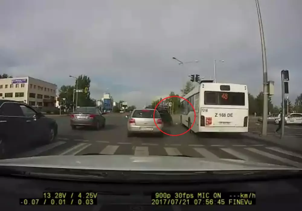 На кадрах видно, что внедорожник Mitsubishi остался в центре перекрестка улиц Сатпаева и Мунайтпасова, перекрыв движение для другого потока автомобилей. Водитель попытался пересечь перекресток до конца, но в него врезался пассажирский автобус № 48, двигавшийся по крайней правой полосе. Спустя несколько секунд после ДТП, автомобиль Mitsubishi уехал с места аварии.