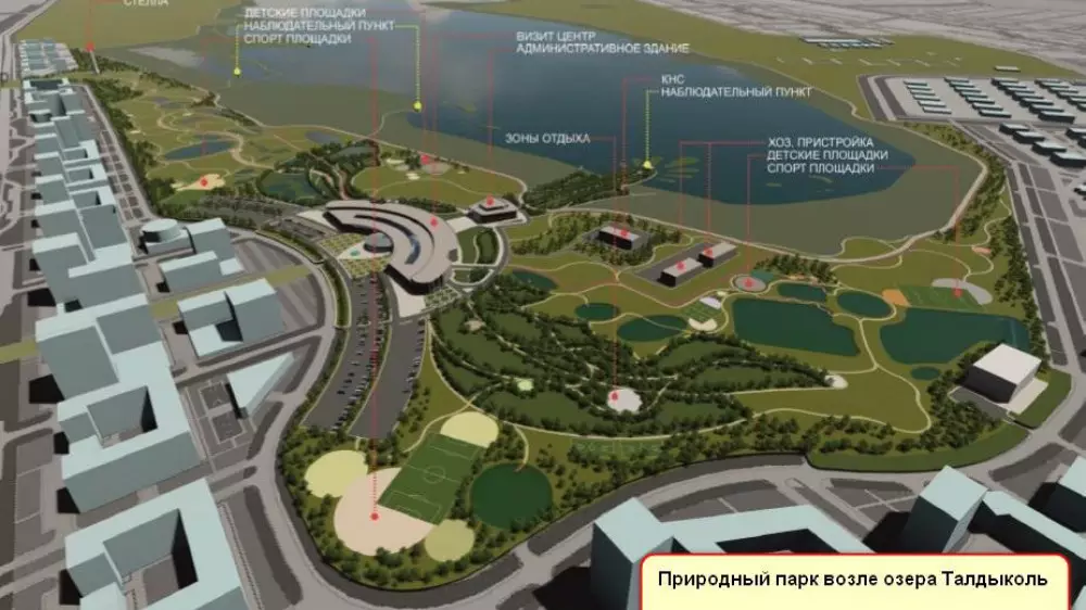 На самом же Талдыколе (Большой Талдыколь) будет своя экологическая инфраструктура. Возле озера Талдыколь появится первый в стране природный парк с заповедной и лесопарковой зоной общей территорией 5 700 гектар.