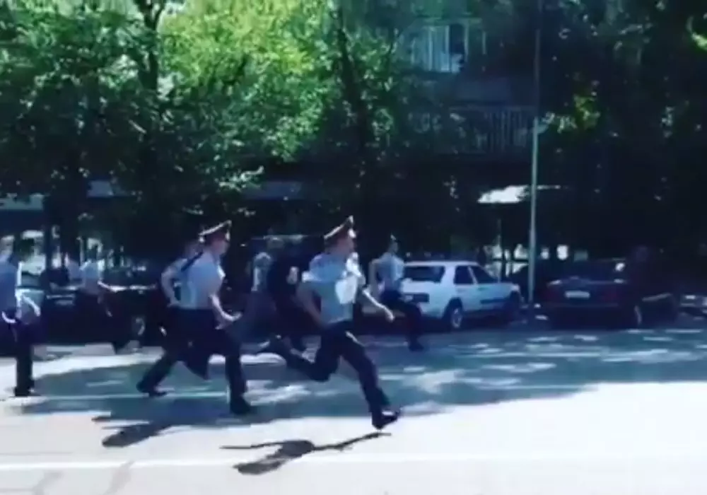 В социальной сети Instagram kris_p_almaty опубликовал видео, на котором полицейские в форме бегут по улице в Алматы, передает Tengrinews.kz.