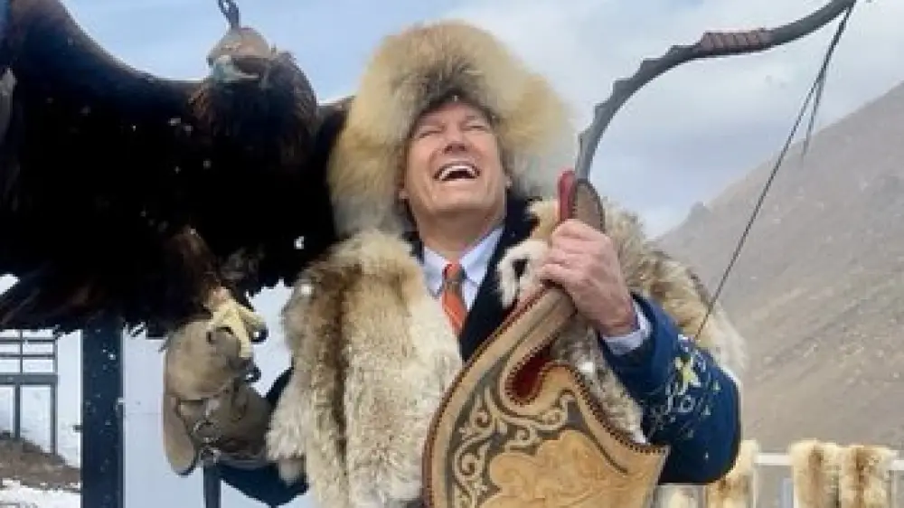 На фотографиях американский гость запечатлен в горах, с беркутом на руке и в компании казахских беркутчи в традиционных костюмах.