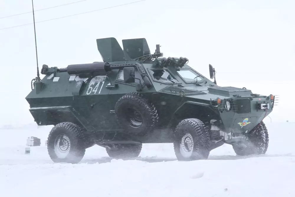 Бронированный автомобиль "Кобра" предназначен для перевозки личного состава. Экипаж составляет 7 человек, объем двигателя 6,5 литра, броня - выдерживает до 7,62 калибра. Максимальная скорость - 100 километров в час. Бак рассчитан на 400 километров.