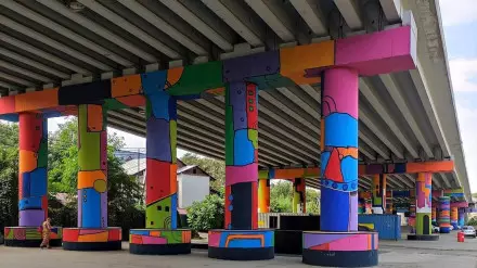 Команда художников Amelin расписывала подпорные колоны моста развязки около трех недель. "Наша команда трудилась в составе восьми человек, из девяти секций мы расписали семь, оставшиеся две расписали другие ребята. Рисунки ничего особо не означают, так как акцент не на смысл рисунков, а на буйство красок", - поделились создатели.