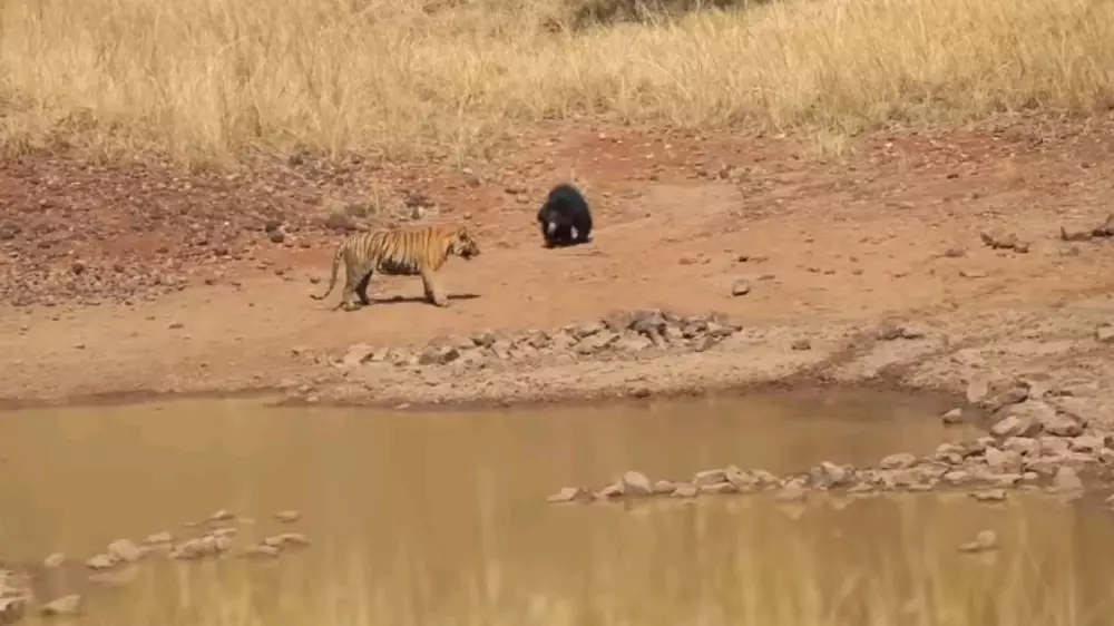 В заповеднике "Тодоба Андхари" в Индии местному гиду удалось запечатлеть схватку между бенгальским тигром и медведем-губачом, сообщает Tengrinews.kz со ссылкой на National Geographic.