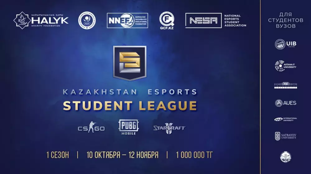 Первый в истории розыгрыш Kazakhstan Esports Student League (Казахстанской лиги по студенческому киберспорту) был проведен в октябре-ноябре 2020 года Федерацией киберспорта страны совместно с Национальным олимпийским комитетом и Фондом образования Нурсултана Назарбаева при поддержке благотворительного фонда "Халык".