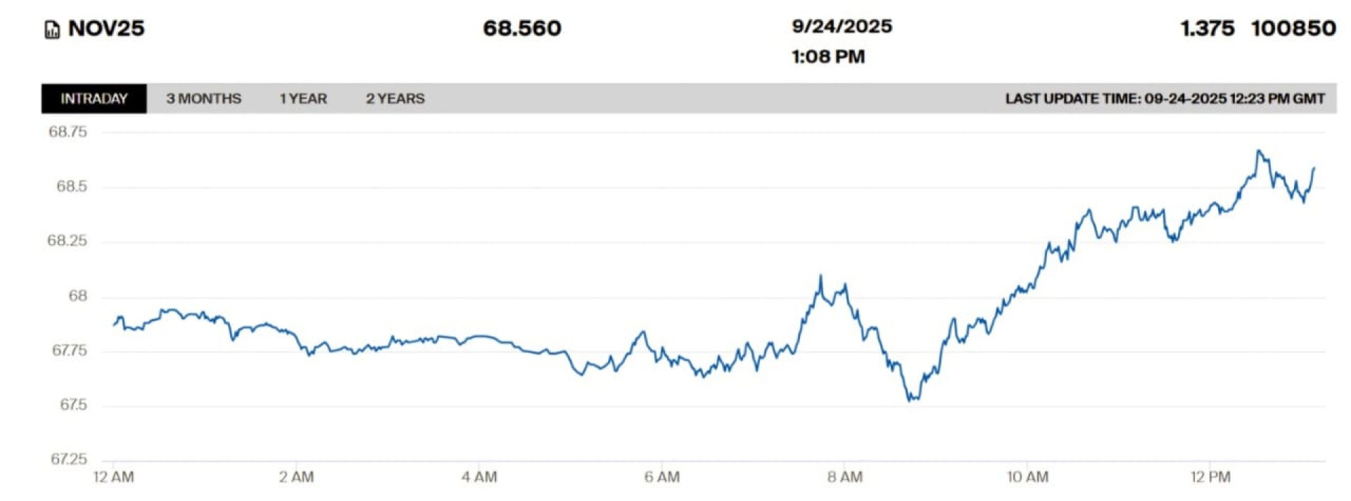 Цена ноябрьских фьючерсов на нефть марки Brent на лондонской бирже ICE повысилась на 1,38 процента - до 68,56 доллара за баррель.