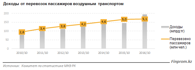 Однако резкое увеличение выручки за счет удорожания стоимости пассажирских перевозок произошло на фоне снижения реальных доходов населения РК. Как отмечают аналитики, за 10 месяцев 2016 года авиакомпании перевезли всего на 71 тысячу человек больше, чем в прошлом году. В течение 2010-2015 годов объем перевозок пассажиров в среднем увеличивался на 450 тысяч человек в год.