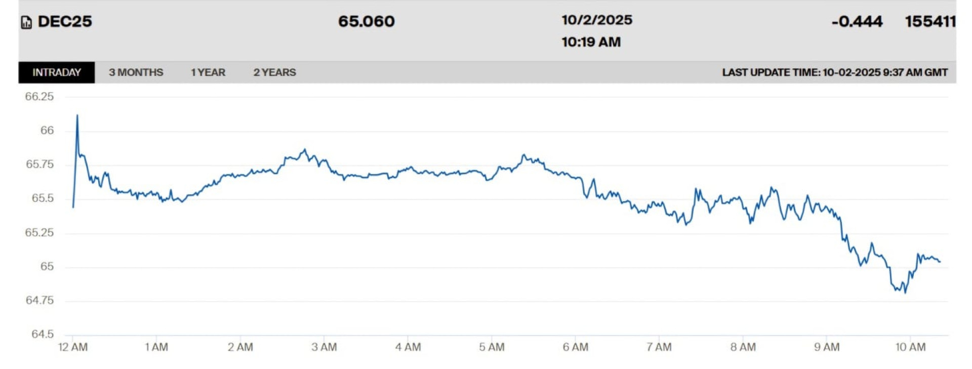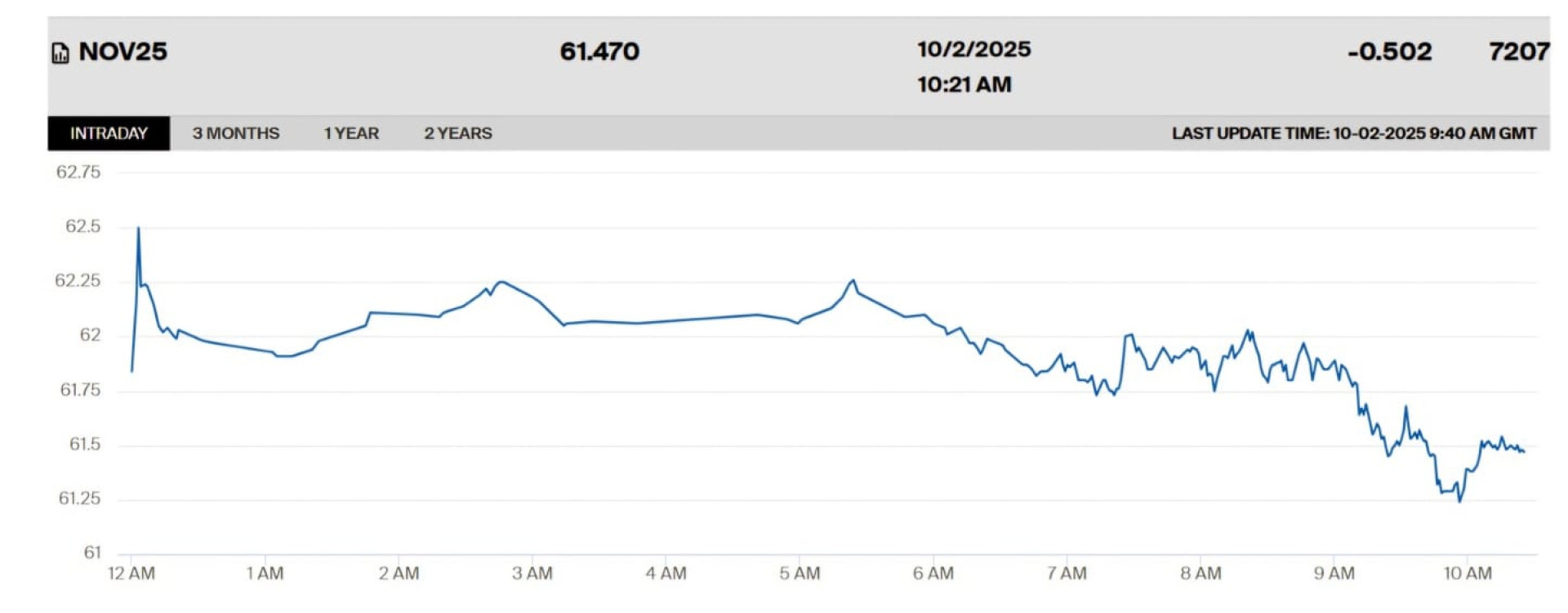 Нефть подешевела из-за опасений избытка предложения: рынки ожидают, что ОПЕК+ может увеличить добычу, что усилит давление на цены. Кроме того, закрытие правительства США усилило неуверенность в глобальной экономике, что часто ведёт к снижению спроса на энергоносители.