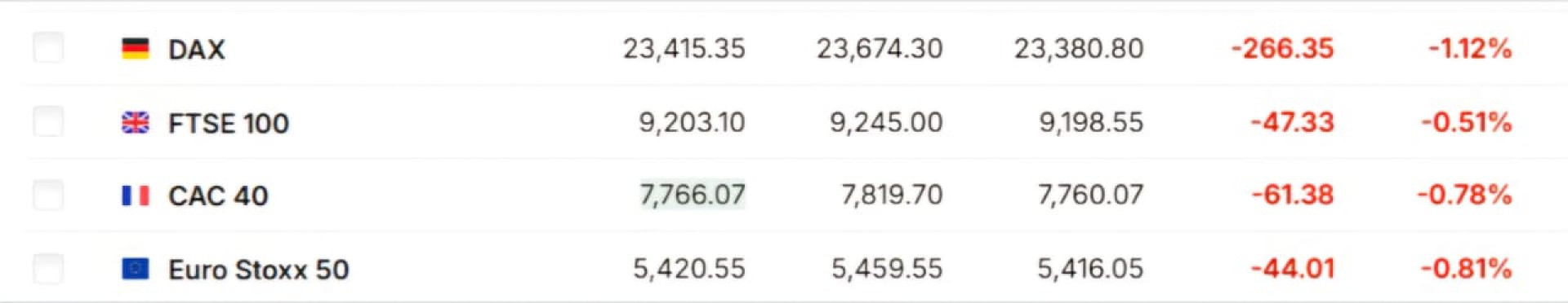 Из основных индексов DAX (-1,12 процента, Германия) и FTSE 100 (-0,51 процента, Великобритания), CAC 40 (-0,78 процента, Франция) и Euro Stoxx 50 (-0,81 процента, включает 50 крупнейших и наиболее ликвидных компаний стран еврозоны) оказались в минусе.