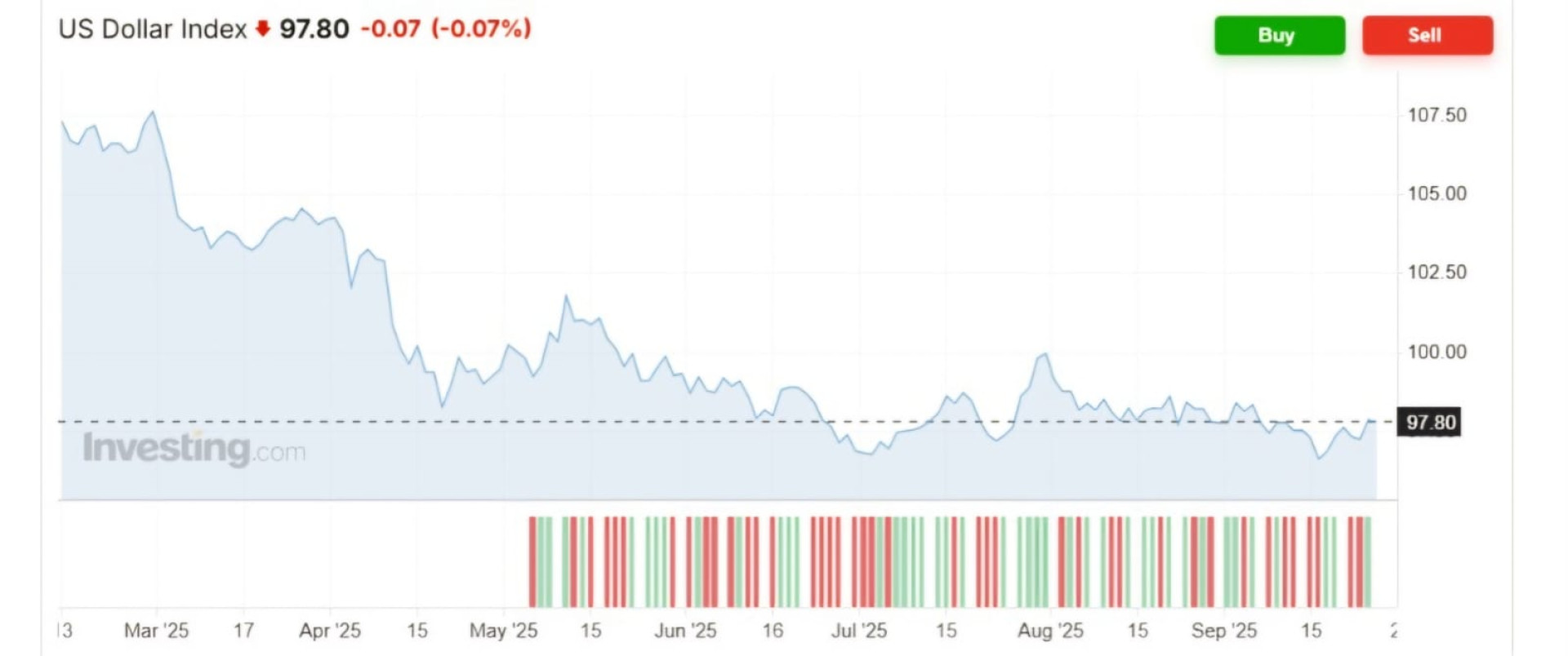 Небольшое снижение индекса доллара связано с ростом ожиданий, что Федеральная резервная система США может снова снизить ставки в октябре, а также с геополитической напряженностью в мире.