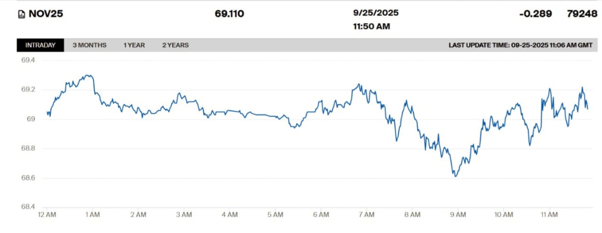 Цена ноябрьских фьючерсов на нефть марки Brent на лондонской бирже ICE понизилась на 0,29 процента - до 69,11 доллара за баррель.