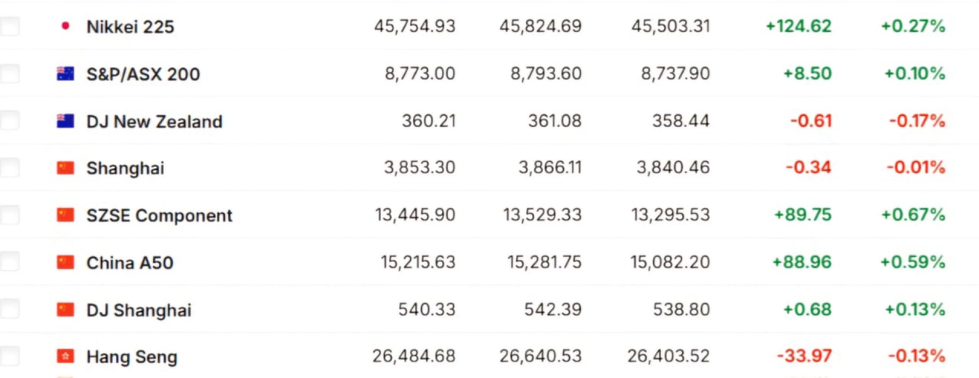 Фондовый китайский индекс Shanghai Composite (-0,01 процента) и Hang Seng (-0,13 процента) оказались в минусе. В сентябре китайские регуляторы обсуждали возможные меры по охлаждению фондового рынка, включая ужесточение мер против спекулятивной торговли. Целью этих обсуждений было предотвращение перегрева рынка и защита интересов мелких инвесторов.