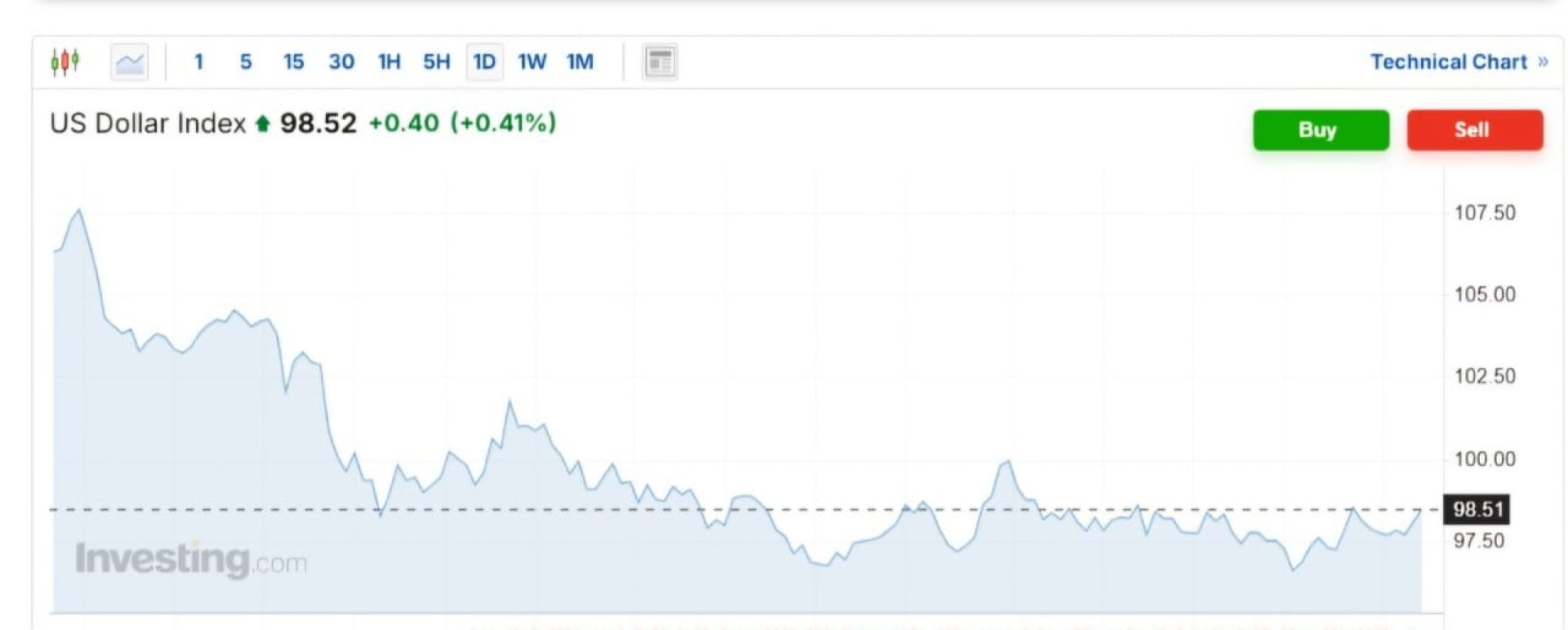 Индекс доллара США (U.S. Dollar Index, DXY, курс доллара по отношению к корзине основных мировых валют: евро, иена, фунт, канадский доллар, шведская крона, швейцарский франк) укрепился на 0,41 процента.