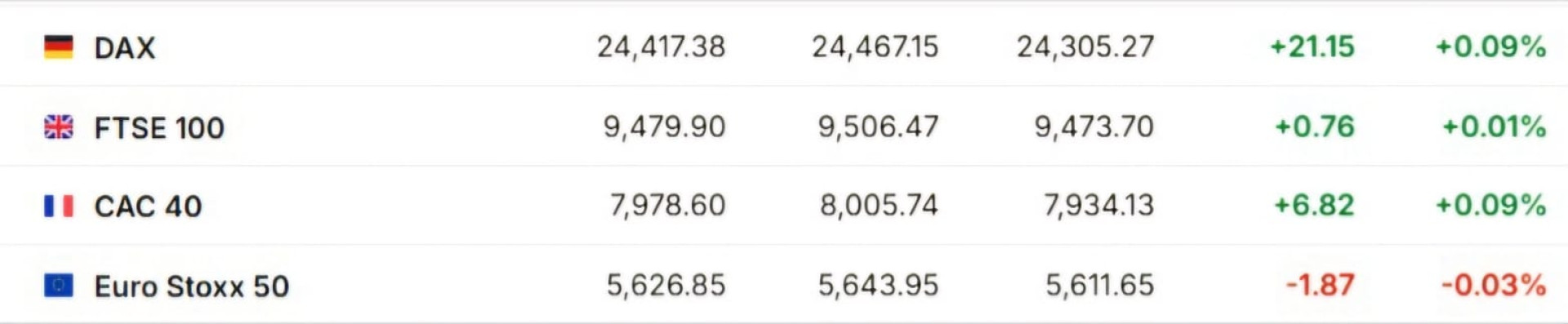 Из основных индексов FTSE 100 (+0,01 процента, Великобритания), CAC 40 (+0,09 процента, Франция) и DAX (+0,09 процента, Германия) оказались в плюсе. При этом Euro Stoxx 50 (-0,03 процента, включает 50 крупнейших и наиболее ликвидных компаний стран еврозоны) показал снижение.