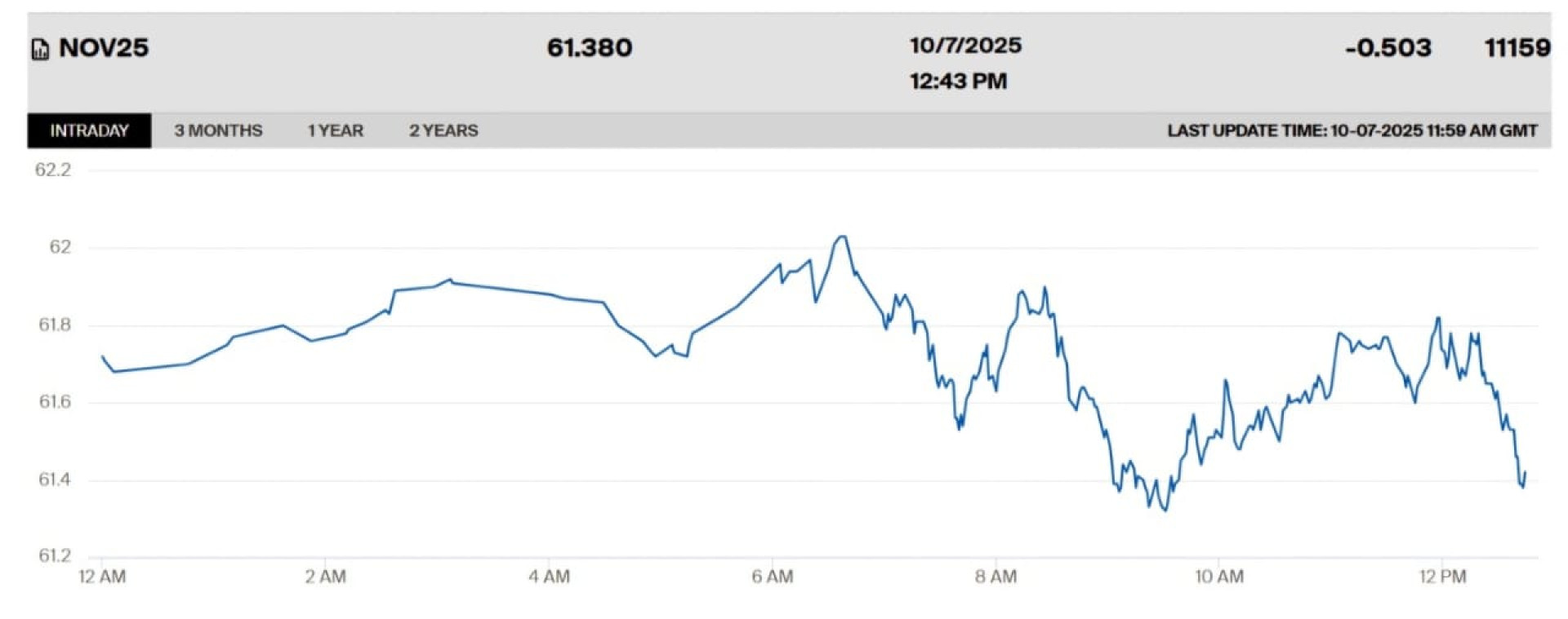 Стоимость ноябрьских фьючерсов на нефть марки WTI уменьшилась на 0,5 процента - до 61,38 доллара за баррель.