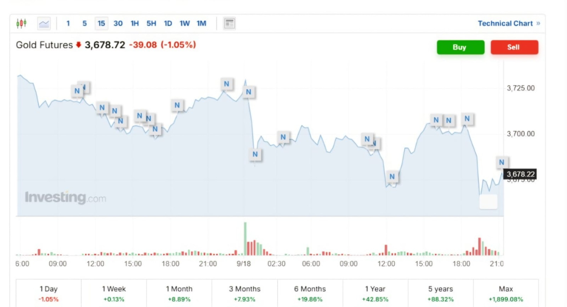 Фьючерс на золото понизился на 1,05 процента - до 3 678,72 доллара за унцию.