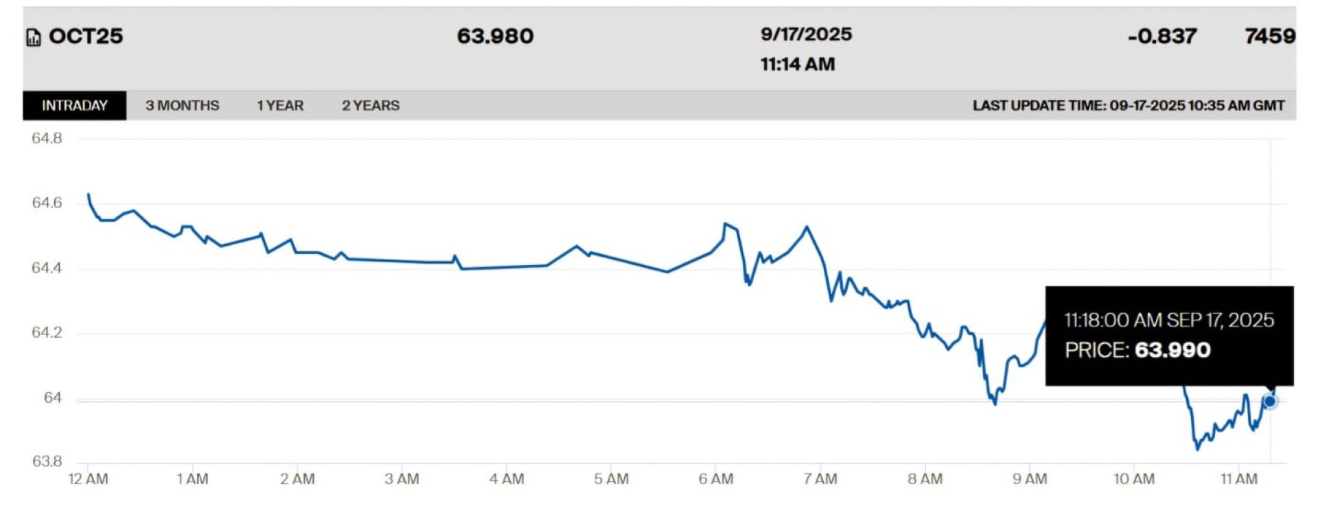 Стоимость октябрьских фьючерсов на нефть марки WTI уменьшилась на 0,84 процента - до 63,98 доллара за баррель.