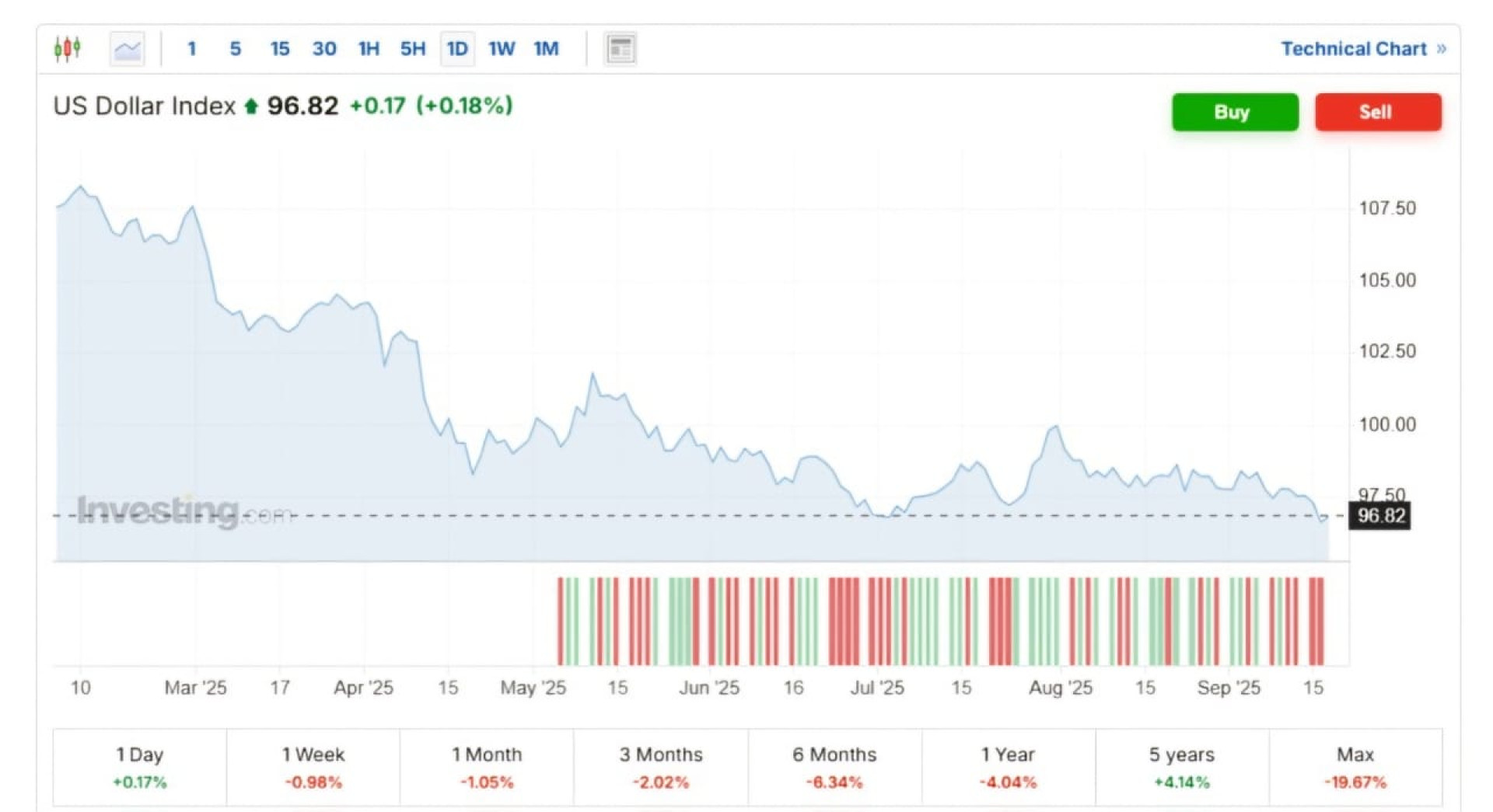 U.S. Dollar Index (DXY, курс доллара США по отношению к корзине основных мировых валют: евро, иена, фунт, канадский доллар, шведская крона, швейцарский франк) окреп на 0,18 процента, потому что инвесторы вчера активно ставили на стабильность USD перед ожидаемым снижением ставки ФРС, они перенесли часть средств в доллар как на более безопасный актив.