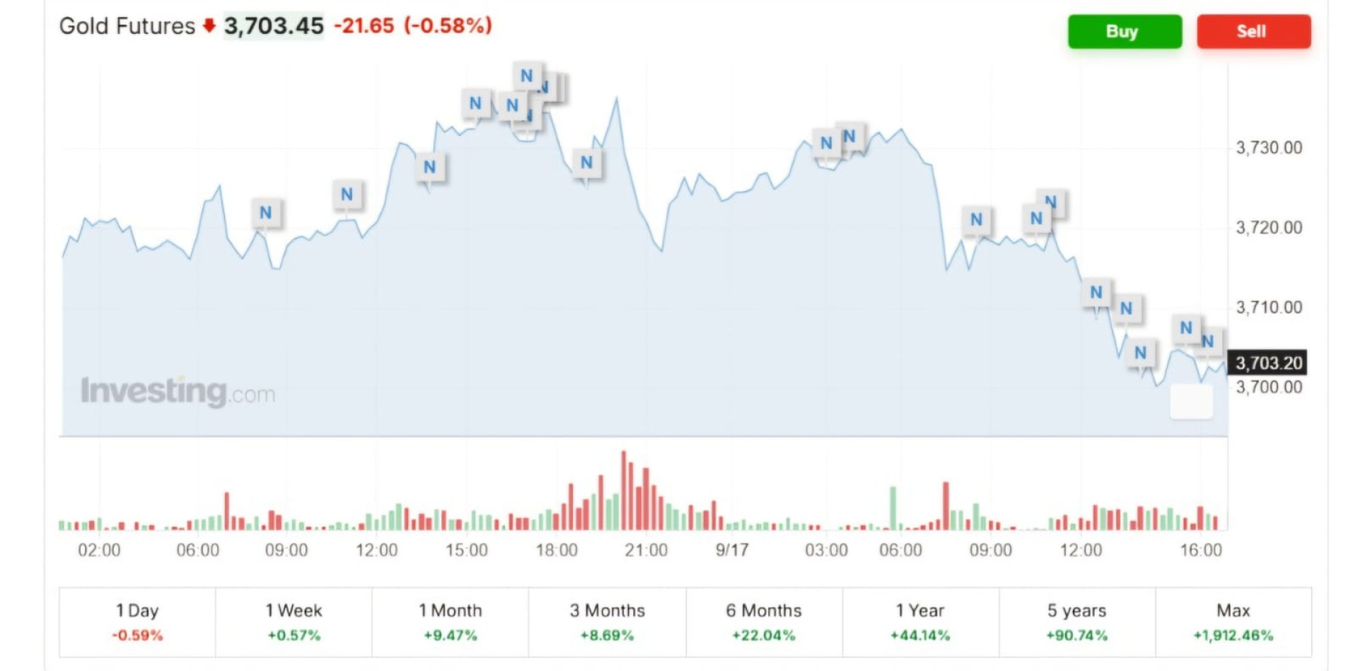 Фьючерс на золото понизился на 0,58 процента - до 3 703,45 доллара за унцию.