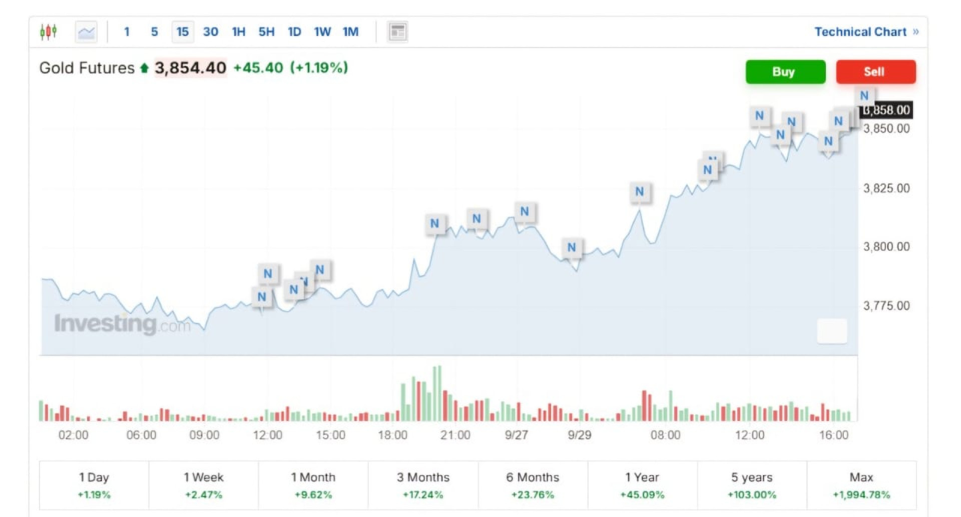Фьючерс на золото повысился на 1,19 процента - до 3 854,40 доллара за унцию.