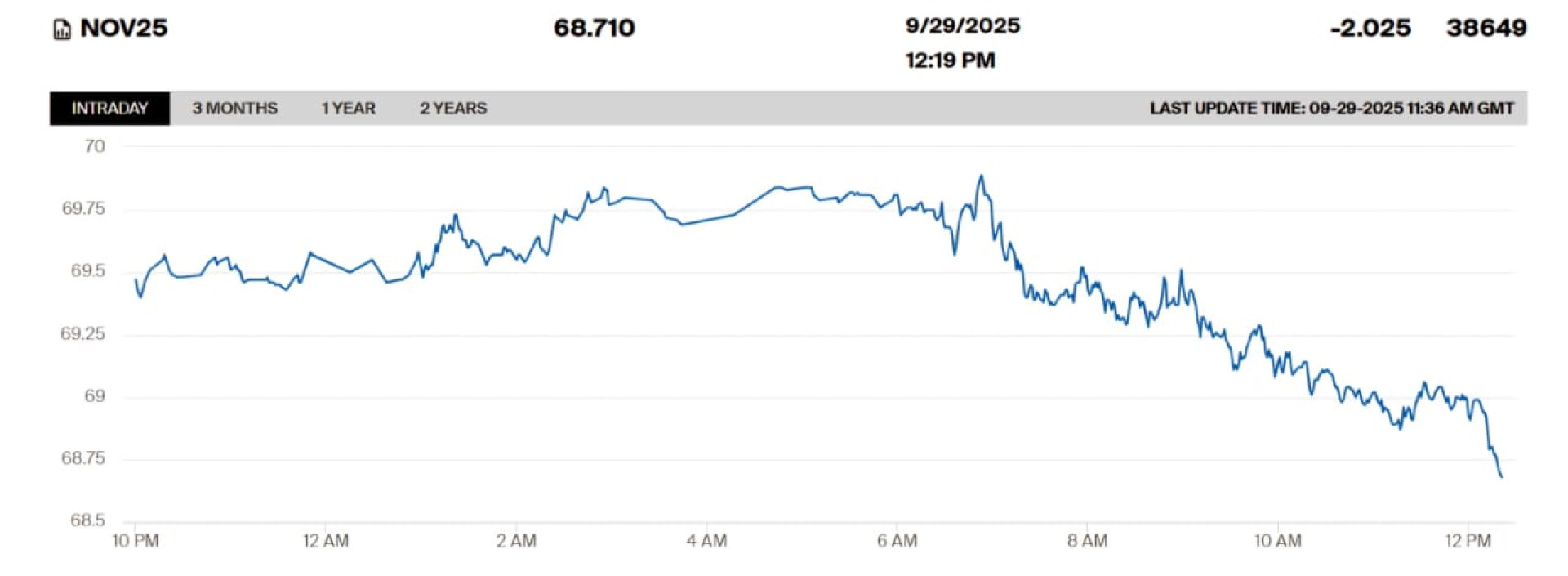 Цена ноябрьских фьючерсов на нефть марки Brent на лондонской бирже ICE понизилась на 2,02 процента - до 68,71 доллара за баррель.