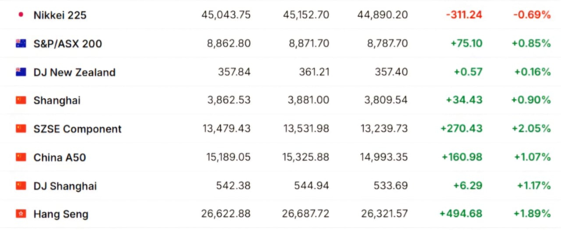 Фондовый китайский индекс Shanghai Composite (+0,90 процента) и Hang Seng (+1,89 процента) оказались в плюсе. Рост китайских акций поддерживается ожиданиями инвесторов относительно экономического стимулирования со стороны правительства, улучшения экономической ситуации и корпоративных отчётностей.