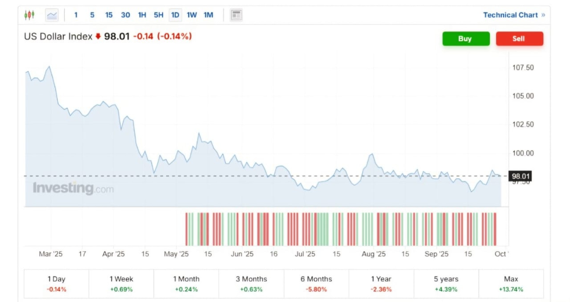 Индекс доллара США (U.S. Dollar Index, DXY, курс доллара по отношению к корзине основных мировых валют: евро, иена, фунт, канадский доллар, шведская крона, швейцарский франк) ослаб на 0,14 процента.