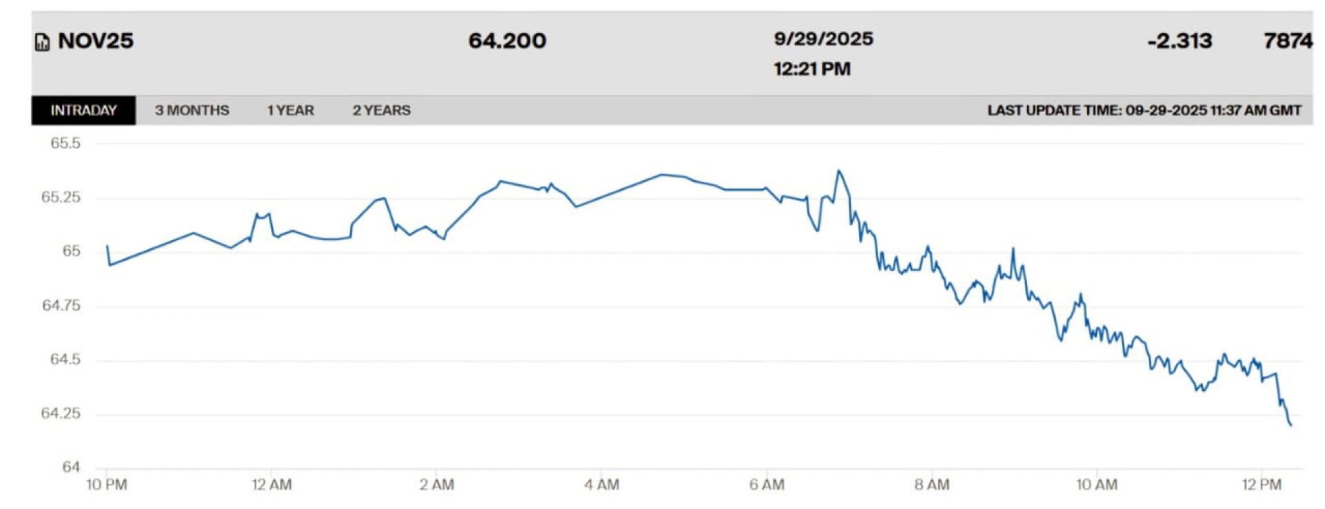 Стоимость ноябрьских фьючерсов на нефть марки WTI уменьшилась на 2,31 процента - до 64,2 доллара за баррель.