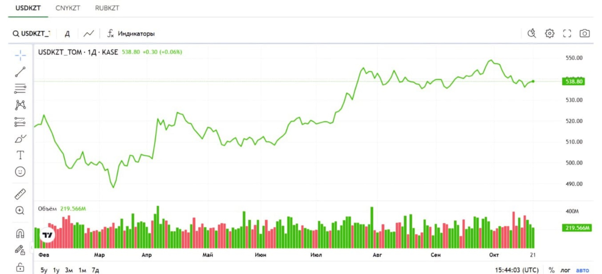 При этом по итогам торгов на Казахстанской фондовой бирже (KASE, на 15:30 по времени Астаны) средневзвешенный курс доллара составил 538,53 тенге, понизившись на 0,08 тенге.
