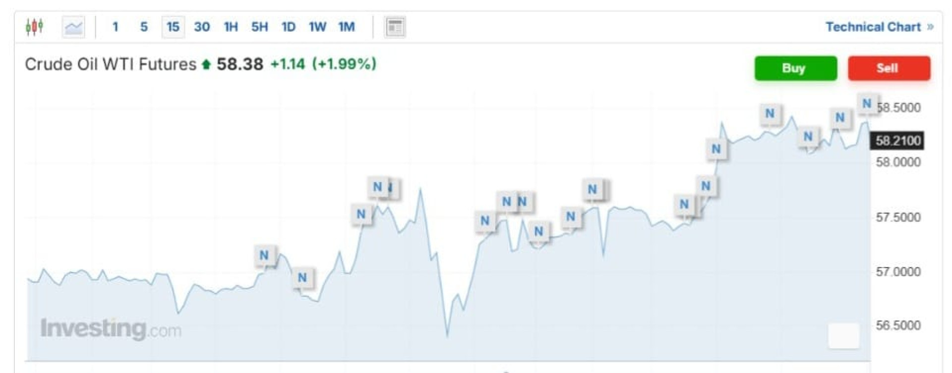 Стоимость ноябрьских фьючерсов на нефть марки WTI увеличилась на 1,99 процента - до 58,38 доллара за баррель.